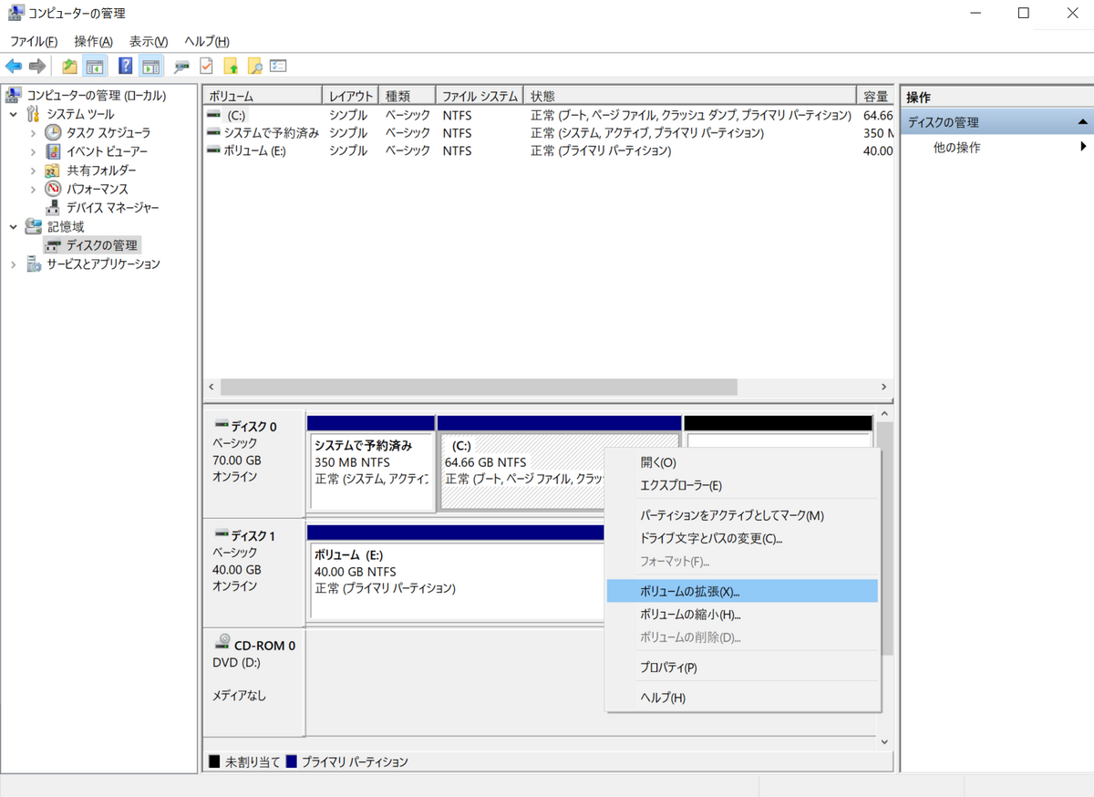 Windowsを立ち上げて、コンピューターの管理からディスク管理を選択。